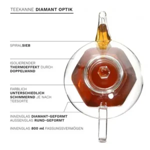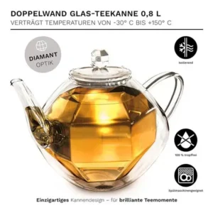 Dank ihres praktischen Glasdeckels und des stabilen Ausgusses ist die Teekanne besonders benutzerfreundlich im Alltag. Sie eignet sich ideal für Schwarztee, Kräuter-, Frucht- oder Grüntee und offenbart je nach Sorte und Ziehdauer ganz unterschiedliche, leuchtende Farbnuancen im Innern – ein faszinierender Effekt, der den Diamantenschliff noch stärker zur Geltung bringt. Die doppelwandige Teekanne Glas mit Deckel ist nicht nur ein praktisches Utensil für den Teegenuss, sondern auch ein stilvolles Highlight auf jedem Tisch. Zudem ist sie spülmaschinengeeignet und besonders langlebig – eine perfekte Kombination aus Ästhetik und Alltagstauglichkeit.