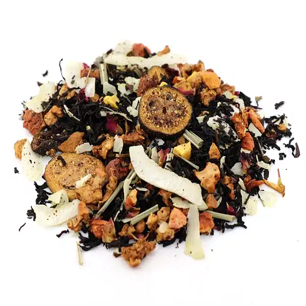 Der Feijoa Kokos Maracuja Tee ist eine aromatische Teekreation, die mit ihrer tropisch-fruchtigen Note sofort Urlaubsstimmung aufkommen lässt. Die ungewöhnliche Kombination aus der süss-säuerlichen Feijoa, der intensiven Frische der Maracuja und der sanften Cremigkeit von Kokos sorgt für ein ausgewogenes Geschmackserlebnis auf Schwarzteebasis. Die natürliche Milde des Tees bildet das ideale Fundament für diese exotische Mischung und bringt die fruchtigen und cremigen Komponenten perfekt zur Geltung.