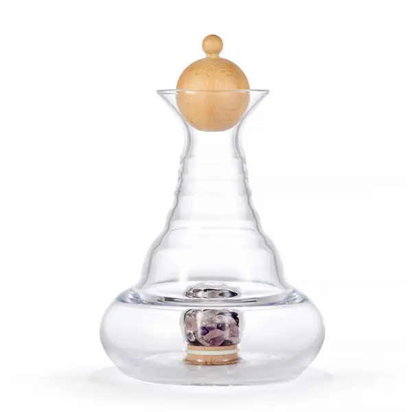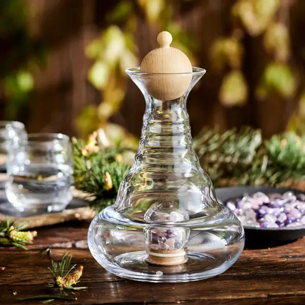 Ein exklusives Detail ist das integrierte Edelsteinfach im Boden der Karaffe. Hier können Sie Edelsteine einsetzen, die durch den Lupeneffekt des Wassers in besonderer Schönheit erstrahlen. Dieses einzigartige Element macht die Karaffe zu einem echten Hingucker und verleiht Ihrem Wasser eine ganz individuelle Note. Der Arvenholzdeckel rundet nicht nur das stilvolle Design ab, sondern verleiht dem Getränk eine subtile, natürliche Frische. Ob für Wasser, Saft oder selbstgemachte Getränke – die Glaskaraffe mit Arvenholzdeckel schafft ein besonderes Erlebnis bei jedem Einschenken.