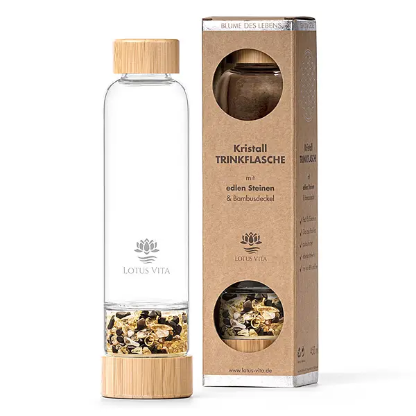Diese elegante Glastrinkflasche mit Edelsteinen überzeugt mit einem edlen, modernen Design und hochwertigen Materialien. Gefertigt aus hitzebeständigem Borosilikatglas, bleibt der Geschmack Ihrer Getränke unverfälscht – ganz gleich, ob Sie Wasser, Tee oder aromatisiertes Infused Water geniessen. Das Herzstück der Flasche bildet das Edelsteinfach im Inneren, das mit Goldberyll und Turmalin gefüllt ist. Diese beiden Kristalle harmonieren nicht nur farblich hervorragend, sondern stehen auch symbolisch für innere Stärke und Ausgeglichenheit. Ein besonderes Highlight ist der verschraubbare Bambusdeckel, auf dessen Oberfläche sowie auf der Innenseite des Edelstahlkerns die «Blume des Lebens» graviert ist – ein Symbol für Harmonie und Lebensenergie.