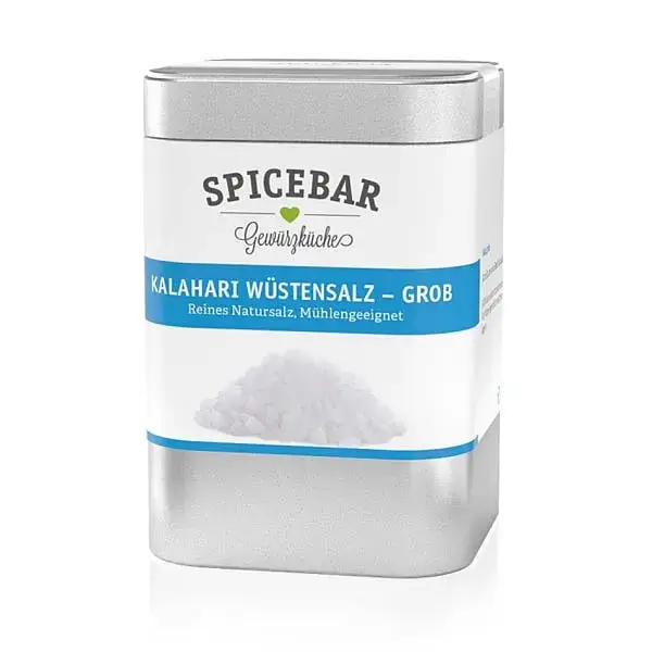Wenn Sie Kalahari Wüstensalz grob verwenden, setzen Sie auf ein hochwertiges Naturprodukt mit Charakter. Besonders attraktiv wirkt es in Kombination mit bunten Pfeffersorten in einer grossen Mühle – ein echter Hingucker auf dem Esstisch. Durch seine Ursprünglichkeit und die schonende Trocknung in der Sonne bleibt das Salz in seiner Struktur und seinem Geschmack vollkommen naturrein. Es eignet sich hervorragend für Gerichte wie Grillfleisch, Pilzgerichte, Fisch oder Eierspeisen. Auch beim Einlegen von Schinken, Gurken oder Gemüse sorgt es für feine Würze und natürliche Haltbarkeit – ganz ohne Zusatzstoffe.