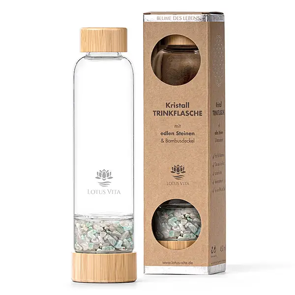 Sanfte Lotus Vita Glas Trinkflasche mit Edelsteinen “Rosenquarz, Amazonit”
