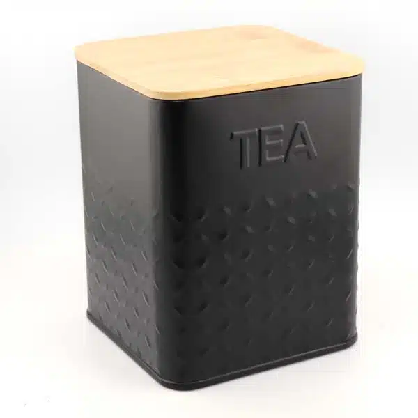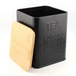 Die quadratische Teedose mit Deckel bietet eine praktische und formschöne Lösung zur Aufbewahrung von trockenen Lebensmitteln oder kleinen Küchenutensilien. Gefertigt aus pulverbeschichtetem Stahl, überzeugt sie durch ihre robuste Struktur und die angenehm matte Oberfläche. Der passende Deckel aus natürlichem Bambus ist mit einem Silikondichtring versehen, wodurch die Dose zuverlässig und luftdicht verschlossen bleibt – ideal, um den Inhalt vor Feuchtigkeit und Fremdgerüchen zu schützen.