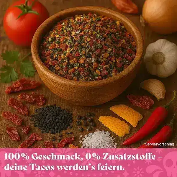 Wer Taco Gewürzmischung kaufen möchte, erhält mit dieser Mischung ein besonders authentisches Geschmackserlebnis. Sie wurde speziell für Tacos entwickelt und überzeugt durch eine fein abgestimmte Kombination aus Tomaten, Schwarzkümmel, Orangenschalen, Cumin, Paprika und Fleur de Sel. Die Aromen sind harmonisch aufeinander abgestimmt und lassen sich ideal mit Tofu, Gemüse oder anderen Zutaten kombinieren – so entstehen im Handumdrehen würzige, mexikanisch inspirierte Tacos.