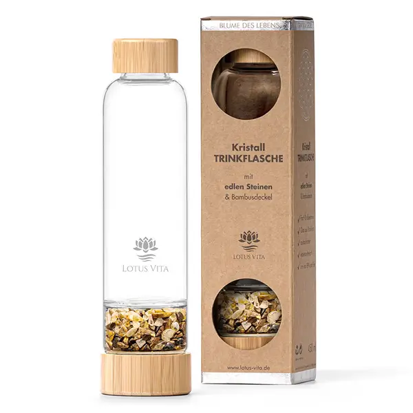 Diese formschöne Trinkflasche aus Glas mit Edelsteinen verbindet minimalistisches Design mit natürlichen Elementen auf stilvolle Weise. Sie besteht aus hochwertigem, geschmacksneutralem Borosilikatglas und ist dadurch besonders robust und langlebig. Im Boden der Flasche befindet sich ein abgetrenntes Edelsteinfach, das mit Tigerauge und Goldenem Beryll befüllt ist – zwei Kristalle, die durch ihre warmen Farbtöne und symbolische Tiefe bestechen. Der abschraubbare Deckel aus Bambus rundet das Design harmonisch ab. Besonders hervorzuheben ist die filigrane Gravur der «Blume des Lebens» auf der Oberseite sowie im Inneren des Edelstahlkerns des Deckels – ein zeitloses Symbol für Ausgleich und Energie.
