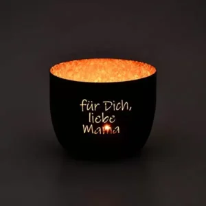 Das Windlicht Mama Geschenk Schwarz Gold ist mehr als nur ein Dekorationsobjekt – es ist ein Ausdruck tiefer Zuneigung. Die hochwertige Metallausführung wirkt modern und doch zeitlos, während die goldene Innenseite das Kerzenlicht weich reflektiert und eine behagliche Atmosphäre schafft. Das gravierte Mama-Motiv wird im Licht besonders schön hervorgehoben und erinnert liebevoll daran, wie besonders dieser Mensch ist.